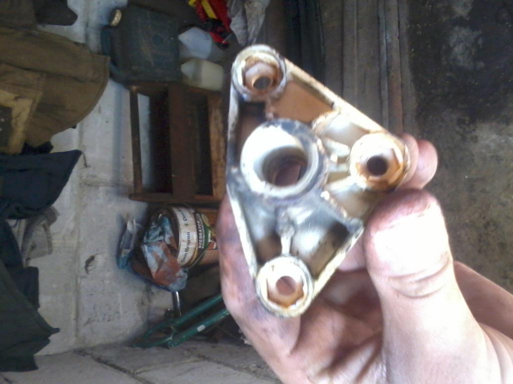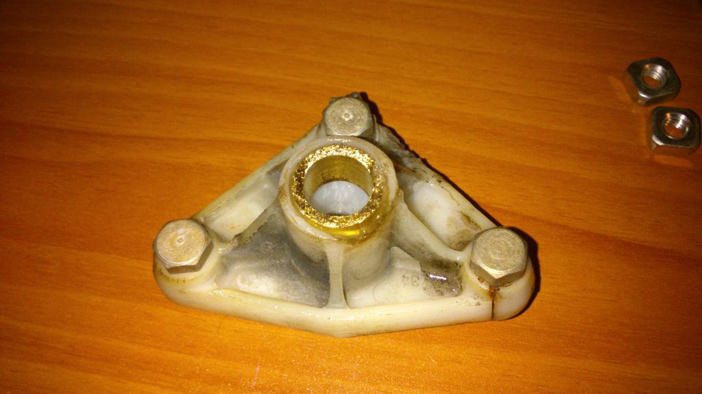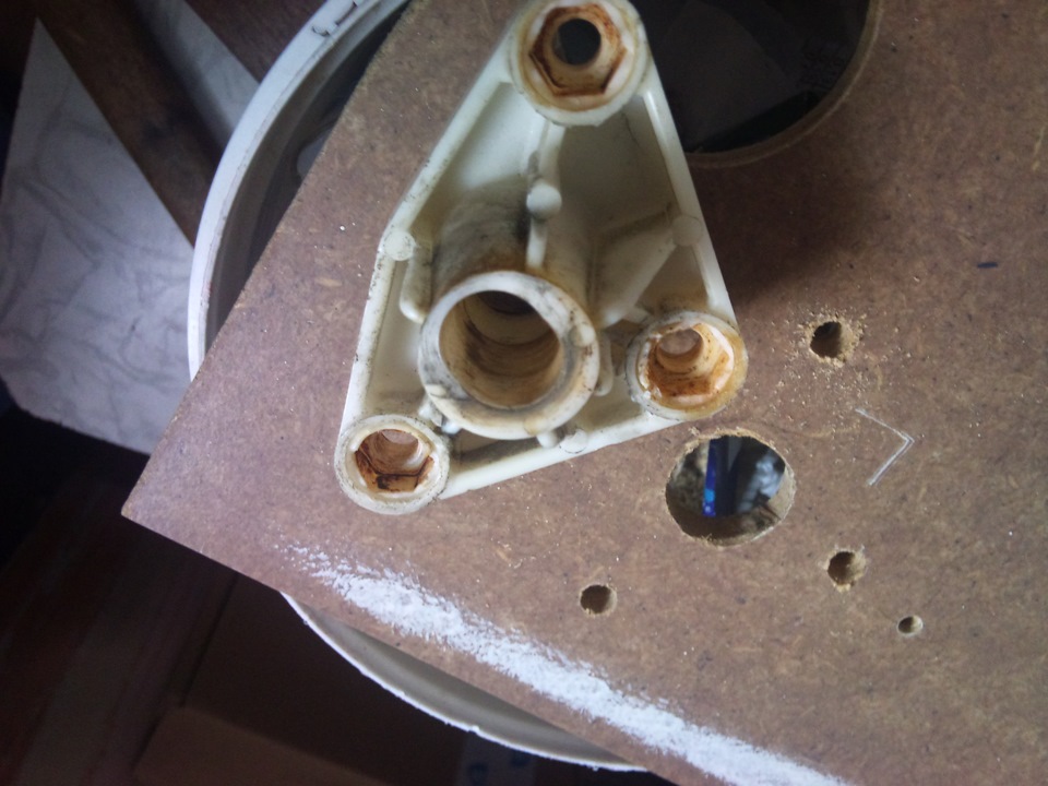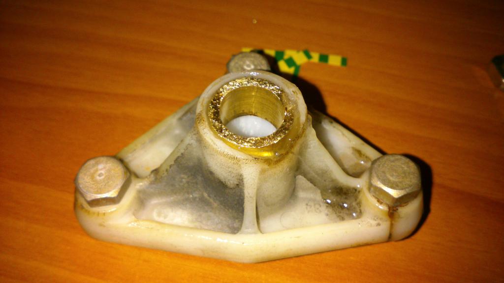 Т.к. рассверливать овальные отверстия в пластмассе нереально, круглым напильником выточил отверстия, которые были примерно круглыми), раз делал руками, поэтому примерно! затем распилил штуцеры на 3 части, 2 части из которых и стали втулками. На фото будет понятно, о чем я. затем вставил втулки в примерно круглые отверстия, зафиксировал их с по краям залил эпоксидкой.