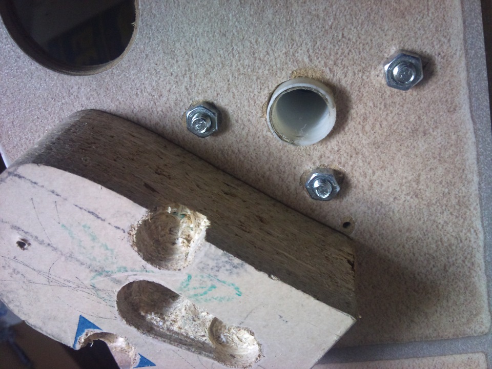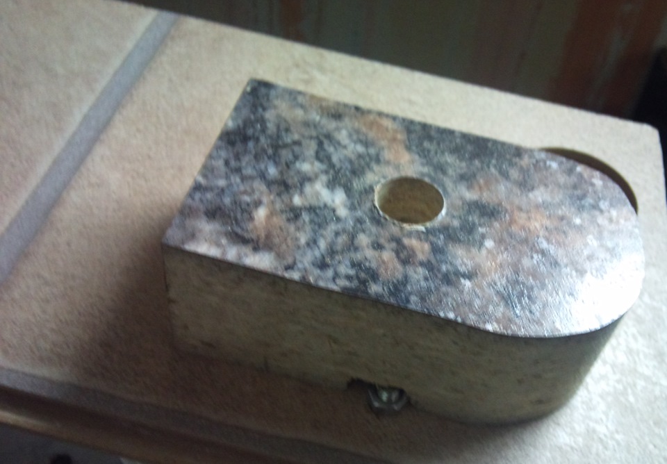 Станка у меня нет. Пришлось сделать приспособу, которая бы направляла сверло ровно по центру. Я сделал из куска столешницы и ламината