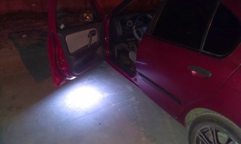 Первым делом решил снять концевики. С пасажирской стороны отвинтил без проблем, а вот с водительской он никак не хотел поддаваться. Ну блин приехали. Побрызгал WD-шкой и пошел к соседу время убить. Убил часа полтора xDD. Вернулся и новая попытка снова в пустую. На помощь прила дрель. Взял сверло и потихоньку начал высверливать. Попытка открутить, но нет. Взял сверло побольше и продолжил. Вот уже скоро и… хрусь…Куча мата и негодования. Но слава яйцам обошлось, винтик поддался. Снял обшивки с дверей и начал протягивать провода через гофру. Плюс брал постоянный, ну а минус через концевики. Подключил, проверил, работает. Пока снят бардачек я протянул новый RCA-кабель ( на старом я один из четырех каналов оборвал ). Теперь вечером приятно выходить из машины. Светится просто супер. Ну и фоточки.