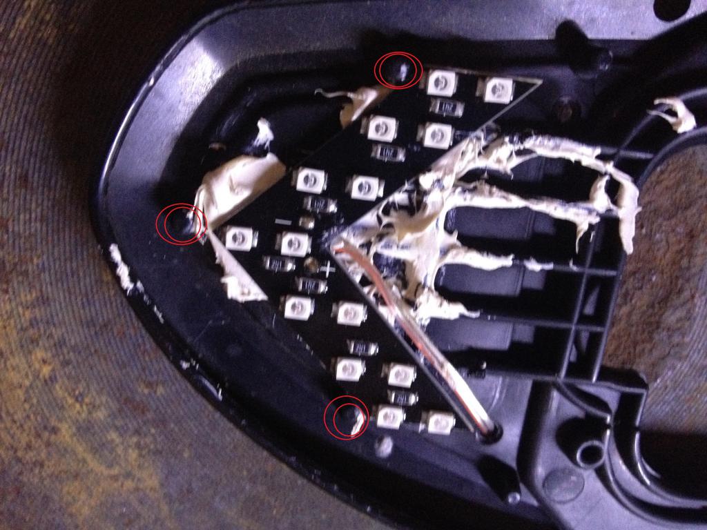 5. Проводочки повторителя пропускаем в как будто специально оставленную дырочку (удобнее к верху зеркала) и прилепливаем саму стрелку так, что бы центр смотрел на центральную "пипку", а углы упирались в "пипки" сверху и снизу" (на фотографии отмечено красным).
