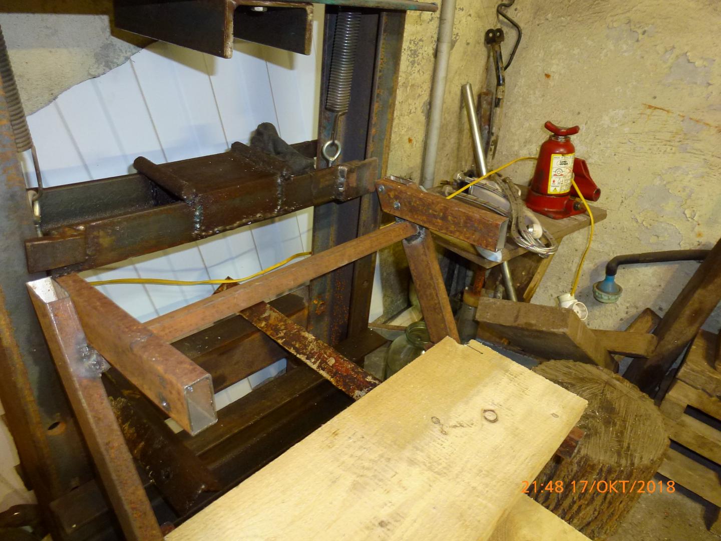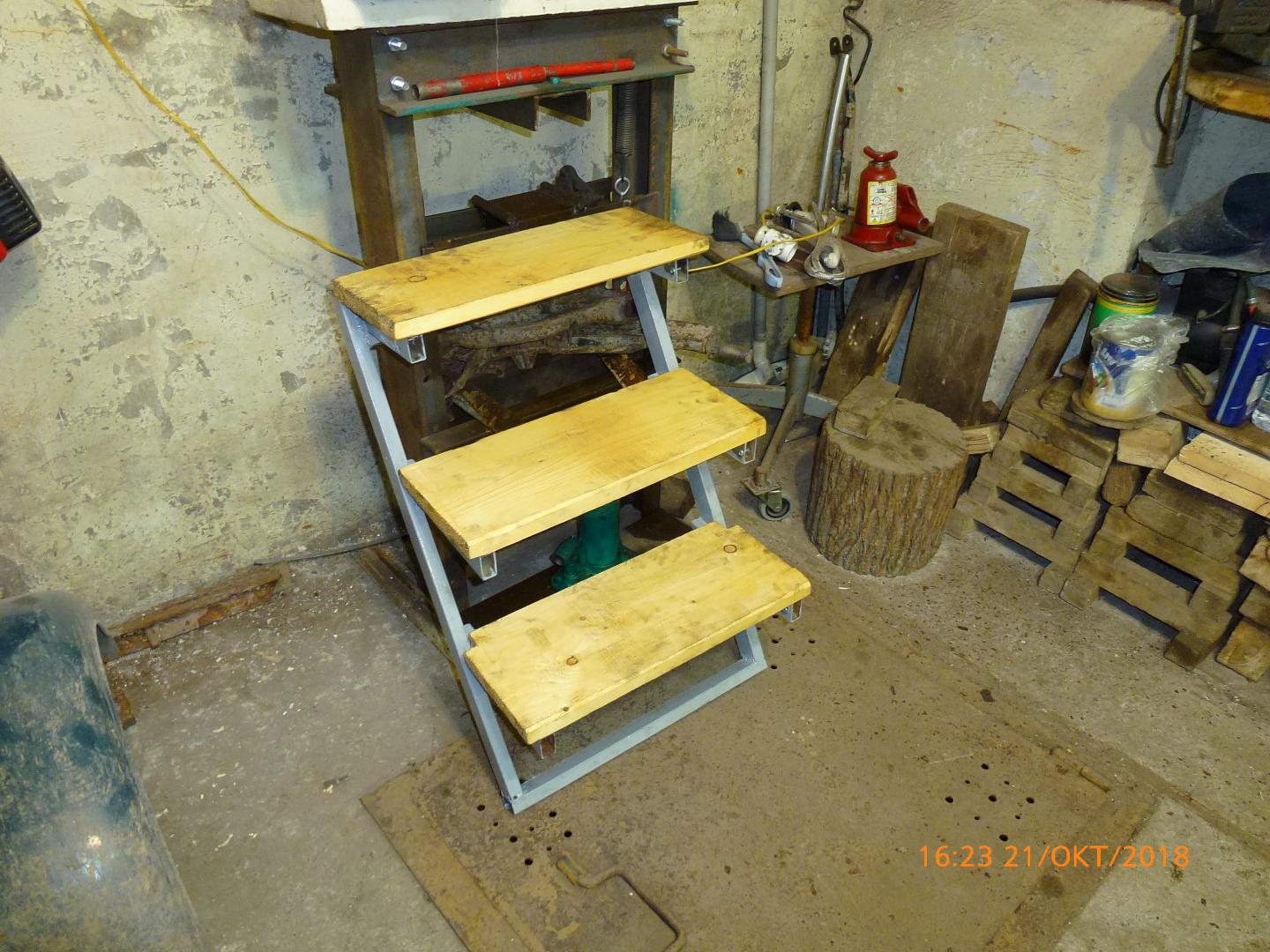 Пошарился по магазинам и не нашёл ничего, удовлетворяющего меня, для того, чтоб легче было из ямы выползать. Посидели с отцом пообдумывали, приезжаю с работы - а тут вот. Надо ещё всё обваривать.Жаль полуавтомата нет, электродкой прожигает приходиться точками варить. Ну и ступеньки рубаночком и красить. + На стене ямы сделать скобку для крючка на верхней перекладины лестницы, чтоб она не скользила по полу.