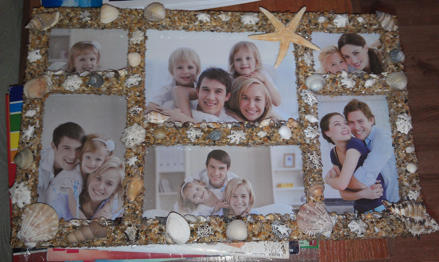 после покрыл это акриловым лаком,чтоб не сыпалось то что не приклеилось и на горячий клей наклеил поверх этого слоя уже целых ракушек (которые мелкие) набранных с дочкой на пляже Азовского моря,ну и более крупных купил тоже там на юге на местном базарчике,вышла вот такая рамка,осталось фотки напечатать