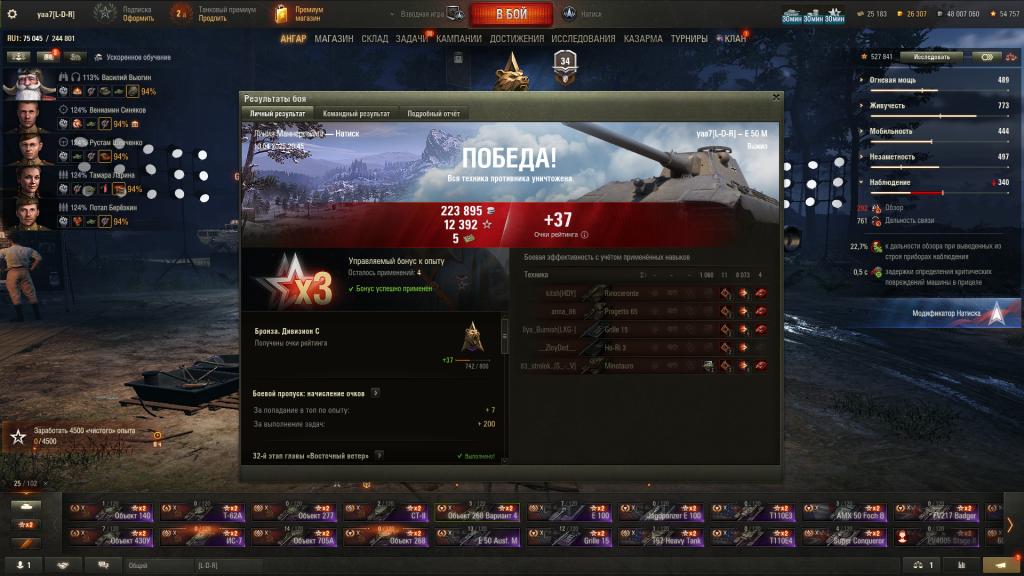 На Е50 остался один против троих Гриль (100%), Минотавр (около 90%), а третьего не помню. Но мне повезло, что третий свалился в овраг с водой и не смог остальным помочь, был добит за 20 секунд до окончания. Ладошки мокрые стали