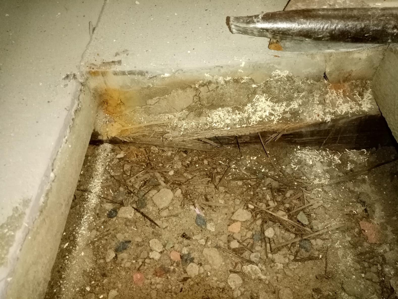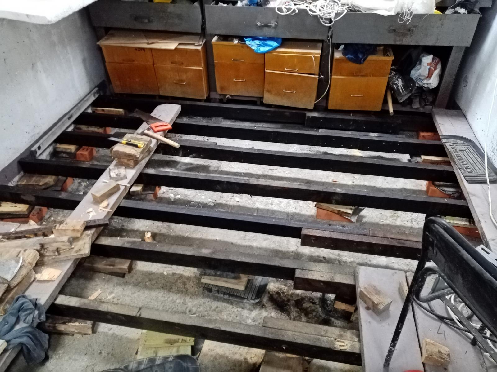 Вскрыл я пол, который со слов прошлого владельца гаража, зять стелил пару лет назад.. а там такой ахтунг, ввиду отсутствия вентиляции (бруски (4х4см лежали прям на бетоне без гидроизоляции а где были щели было насыпано землей и она была ес-сно сырой ,из за такого разбиения на "отсеки" вентиляция отсутствовала совсем и еще и и подсоса бетоном воды из грунта от рядом стоящего (и сифонящего как я понял позже) колодца канализации
