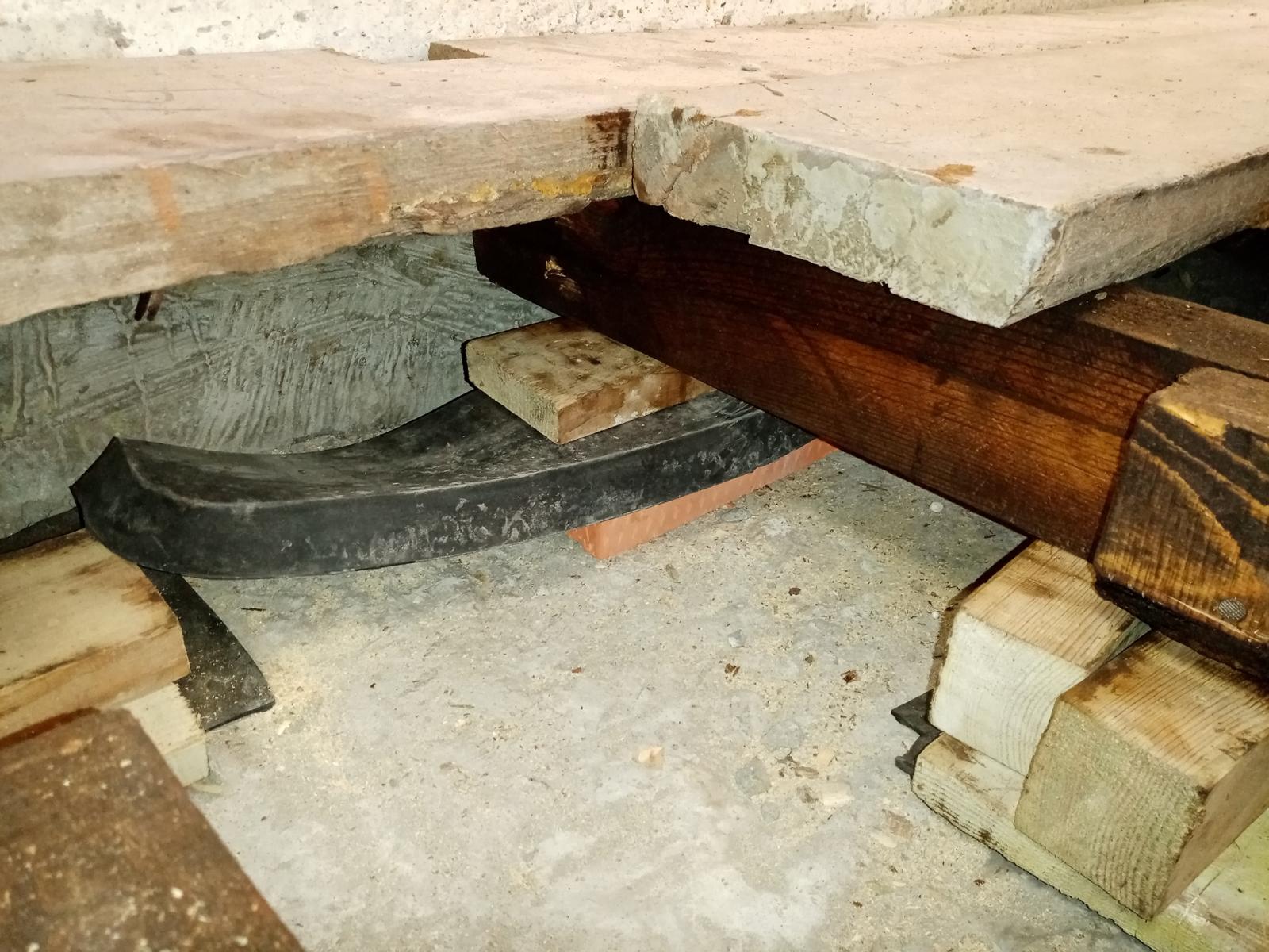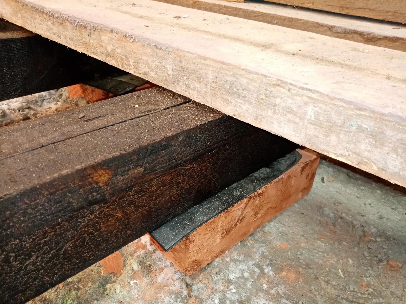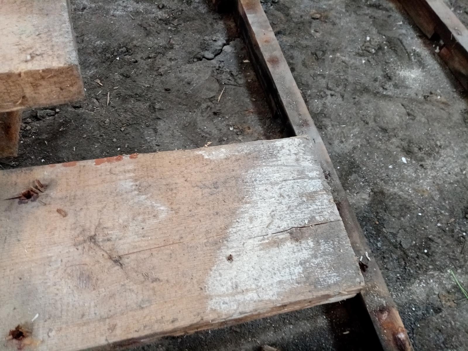 ждал около 1,5 недель, потом продолжил напилил новые лаги, 5х10см сечением, пропитал их отработкой с битумной мастикой,доски где был белесый грибок (но сухой видимо такими уже стелили они видно что бу со старого дома наверное 50мм толщиной смолянистые,ни как сейчас с горельника пустые доски идут, без смолы совсем т.к. она выгорела.) стесал ,сначала отбелил составом с хлором и потом обработал пропиткой против грибка. начал стелить новые лаги. Но так как бетон залит "мимо ехал зил с бетоном и опрокинулся" то получилось в одном месте и кирпич и подкладка из доски и лага,а по центру только подкладка.теперь вентиляция под лагами обеспечена! Мне как раз тут отдали кучу ковриков старых салонных вот часть их пустил на гидроизоляцию между бетонным полом и подкладкой