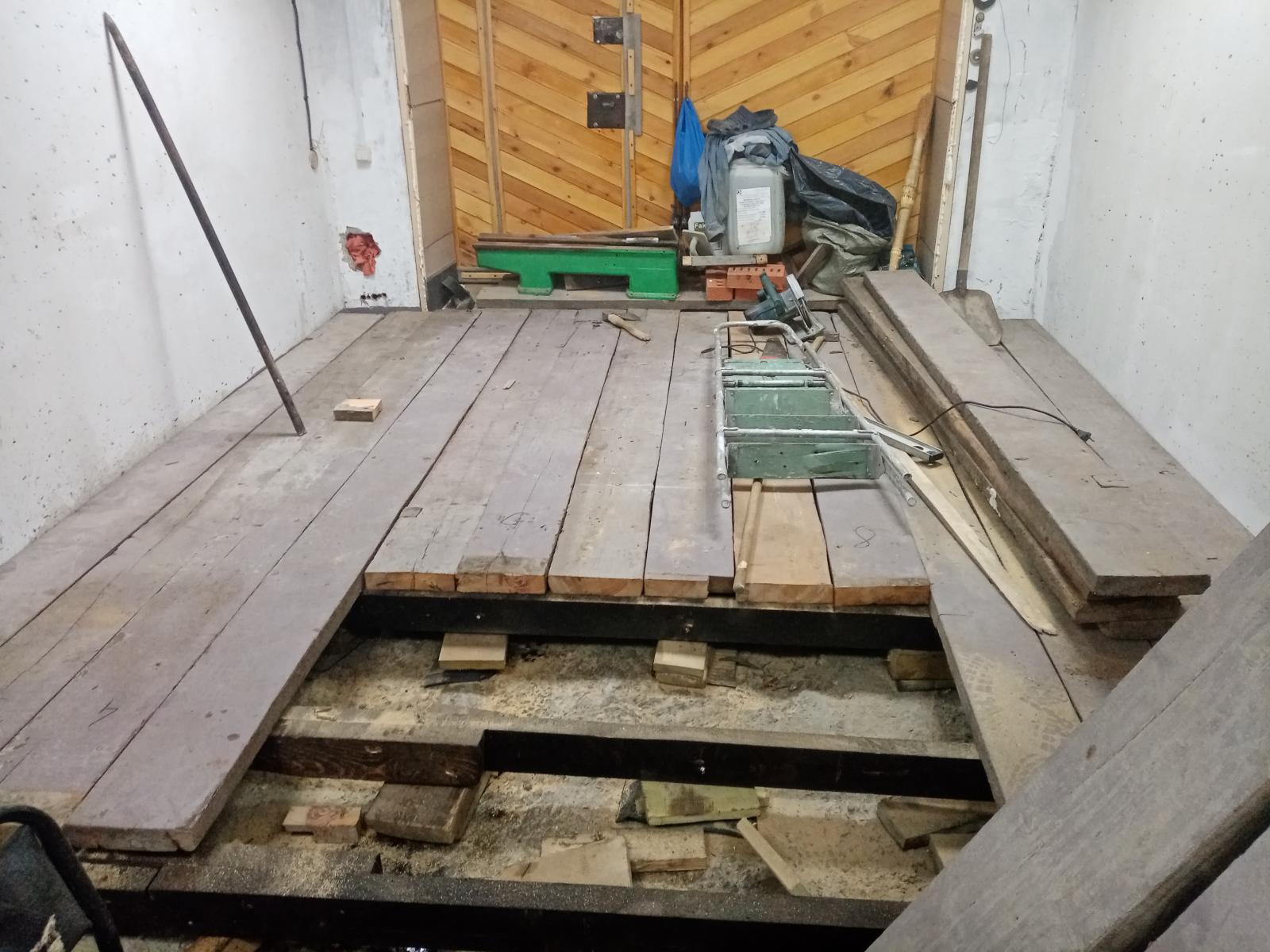 .Понемногу застелил пол обратно, одна доска оказалась почему то сильно сгнившая по центру (гниль тоже сухая тем не менее решил заменить ее .тем более тут в гараже, в качестве полочки лежала как раз подходящая доска.