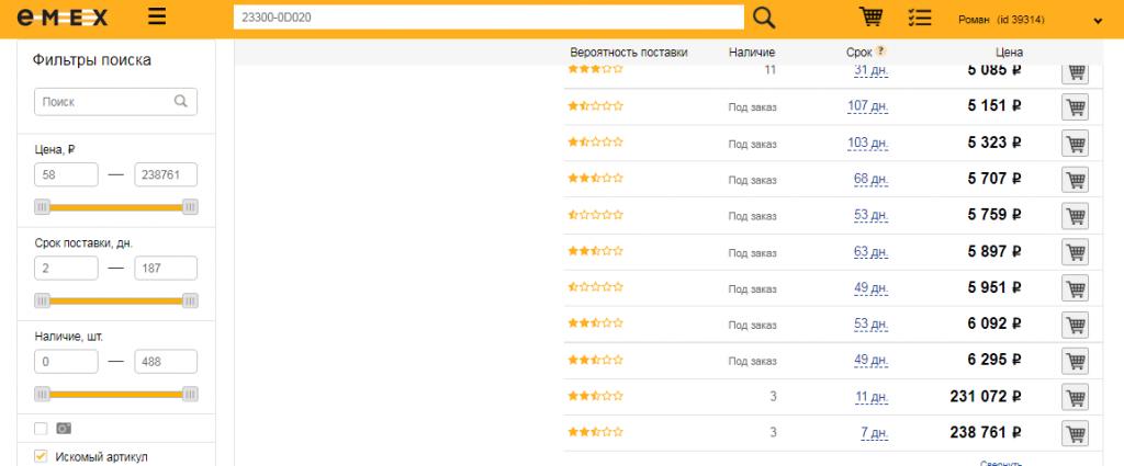емекс буреть начал, раньше однозначно у него ценник был ниже экзиста, на все позиции единственно разница была где то больше ,где то меньше и поэтому если я заказывал например фильтр салона в экзисте (он в 5 минутах пешком от меня) на 2-3 рубля дороже, при цене 250руб т.к. до емекса ехать далеко,больше бензина сожгешь, то нынче все поменялось..недавно брал лобовое стекло в экзисте 6500р орег, в емексе 7300р и многое уже так стало..чтото меняется..